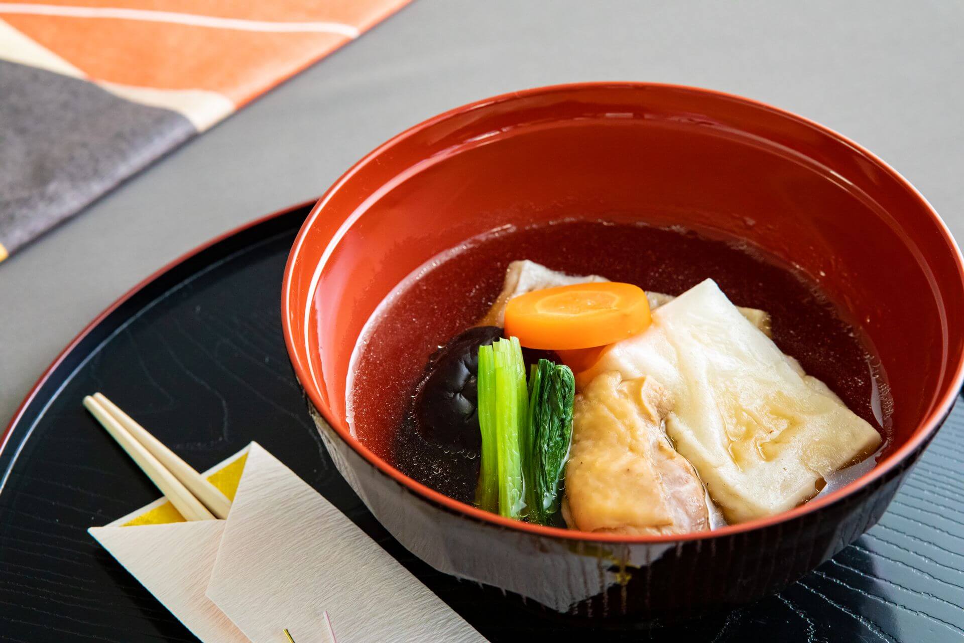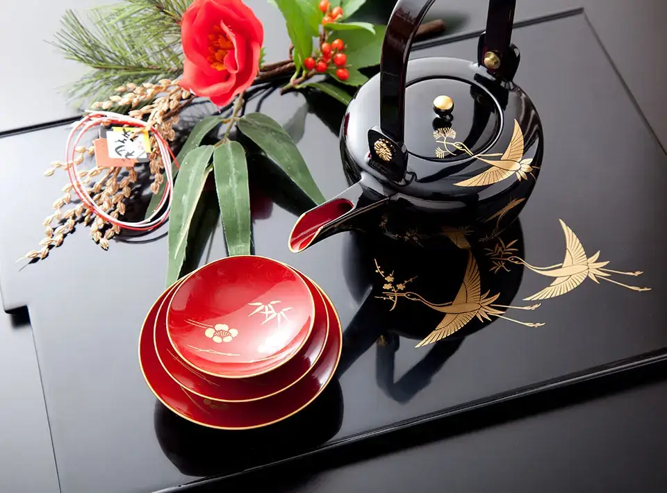 Các nguyên liệu như là đậu đen, trứng cá trích, tôm nướng, cà rốt và củ cải ngâm dấm, “datemaki” (※)… Mỗi món ăn đều mang ý nghĩa may mắn, cầu chúc cho sức khỏe và sự trường thọ. Tất cả được gói gọn bên trong chiếc hộp “jubako” nhiều tầng với ý nghĩa “chồng niềm vui, sự hoan hỉ lên nhiều tầng, nhiều lớp.”