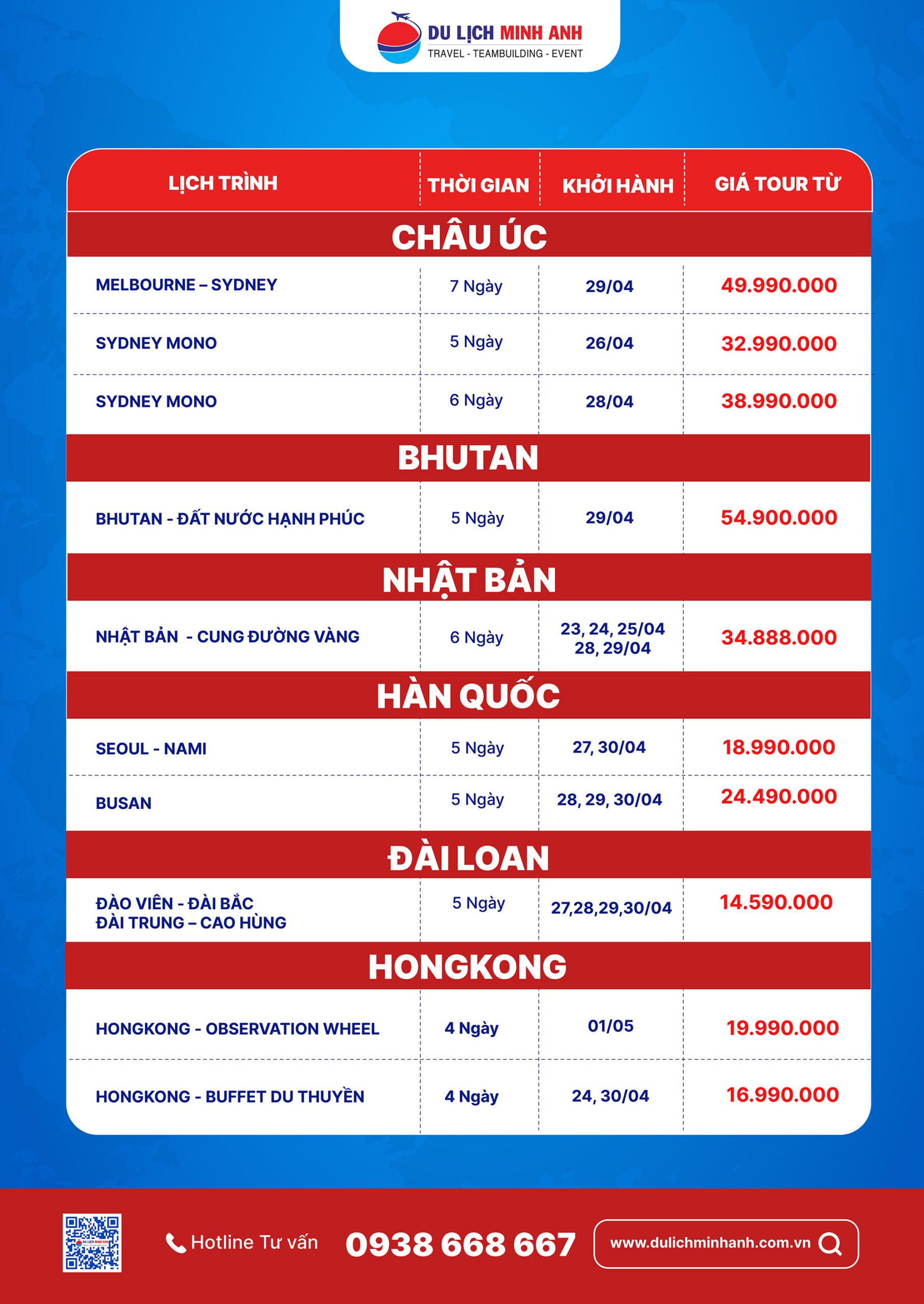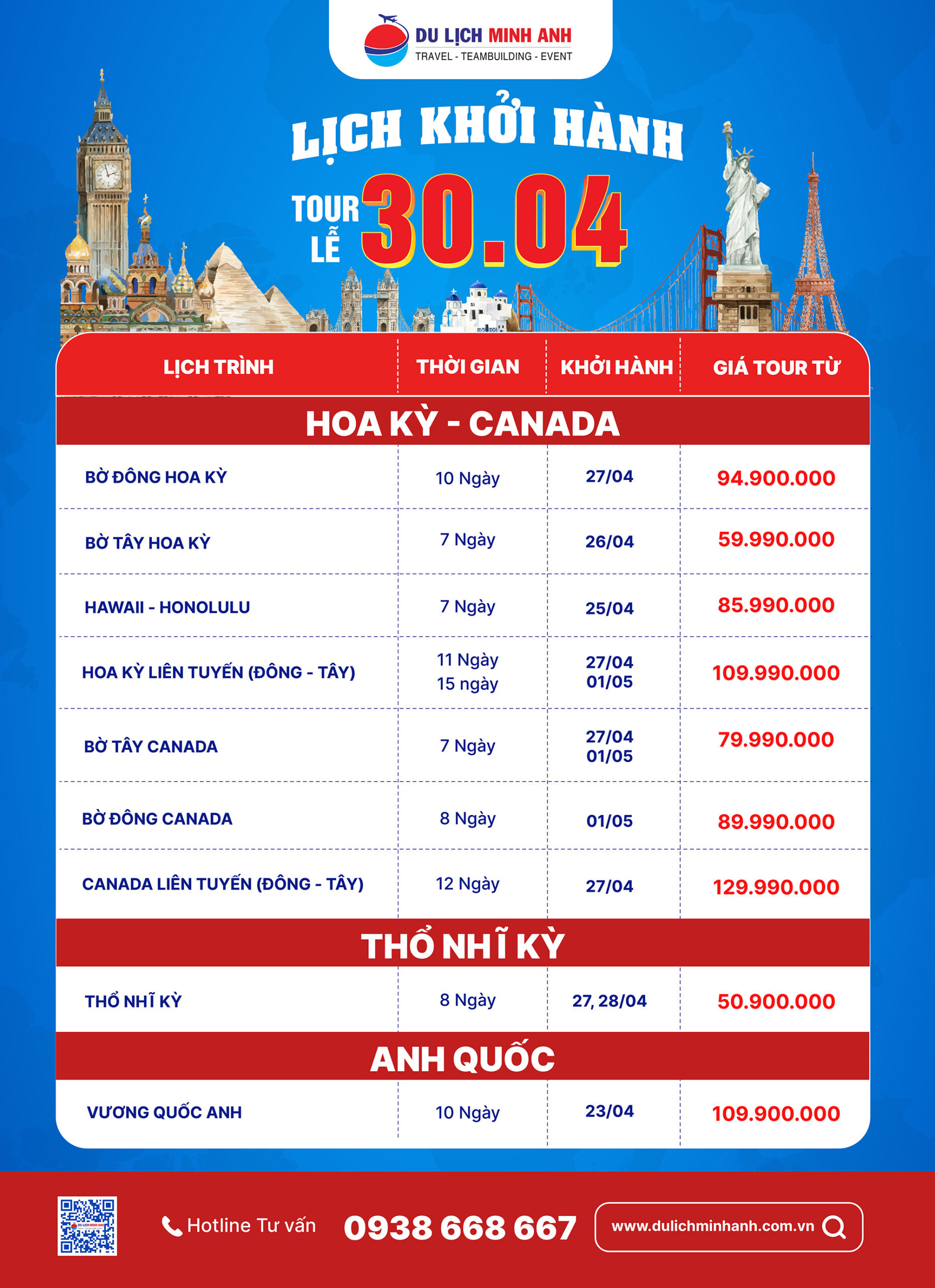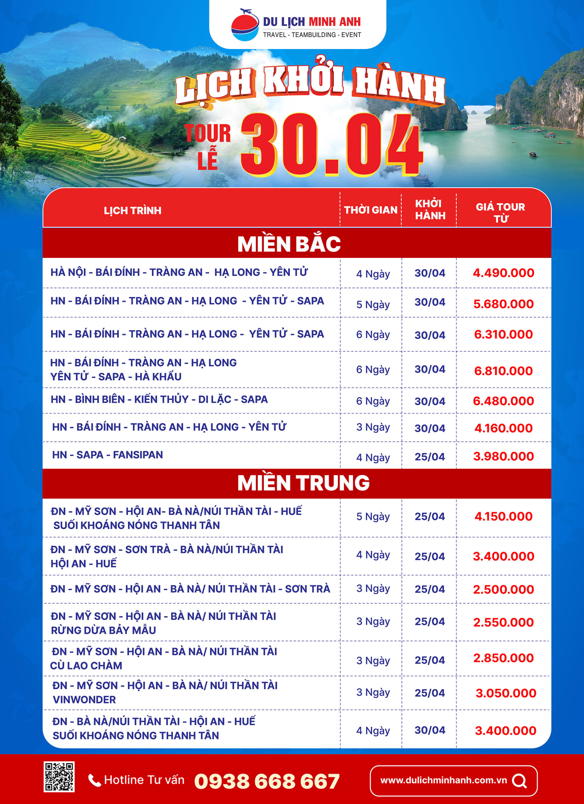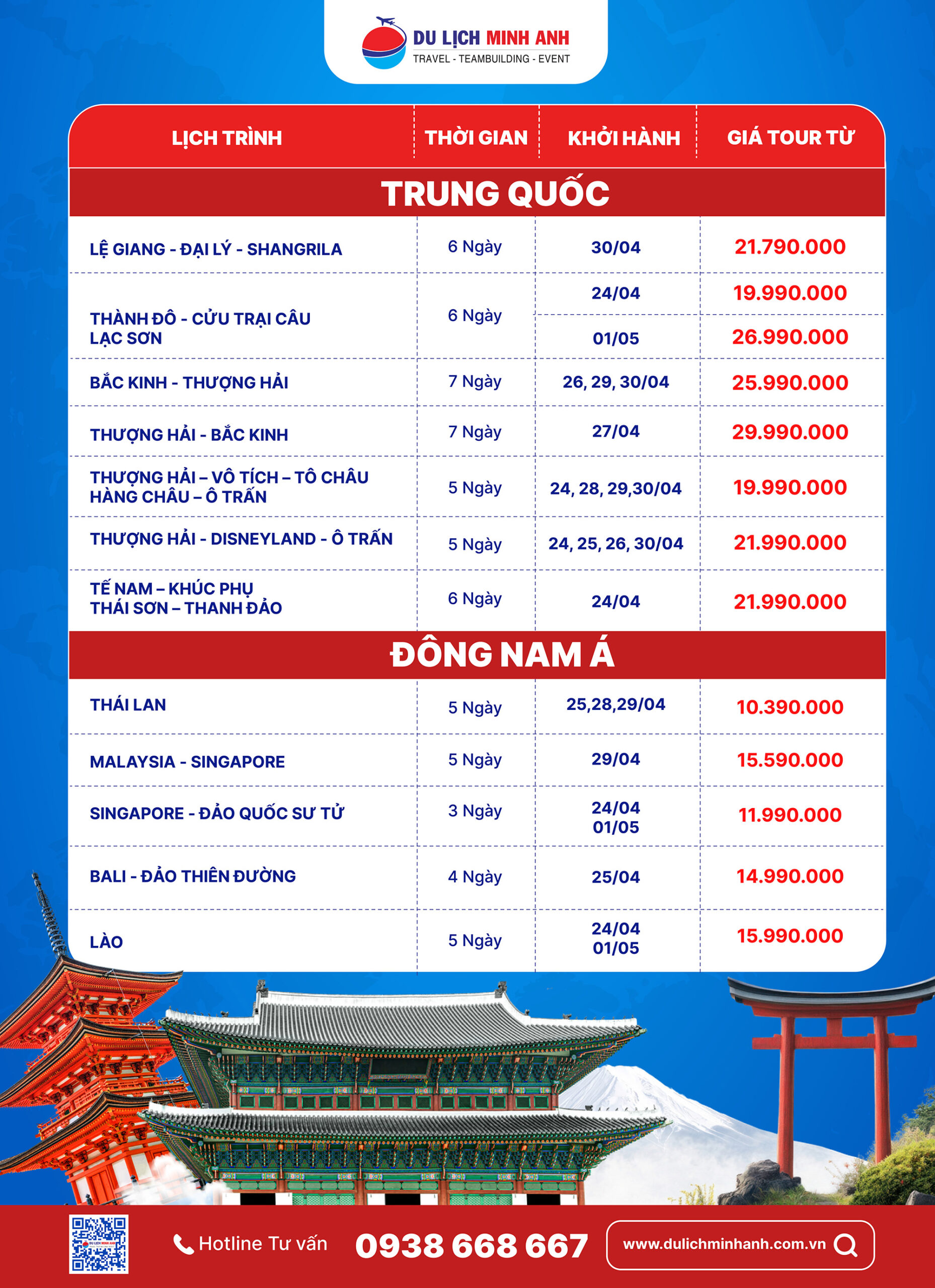 Du lịch Minh Anh giới thiệu đến Quý khách chùm tour lễ 30/04 & 01/05 được thiết kế chọn lọc với những hành trình mới và có nhiều sự lựa chọn. Từ những điểm đến trong nước, các nước châu Á đến các hành trình sang trọng trời Âu hay Mỹ, mỗi tour đều được thiết kế tinh gọn, dịch vụ chuẩn chỉnh, lịch trình thoải mái để quý khách và gia đình tận hưởng trọn vẹn từng khoảnh khắc trong dịp Lễ.